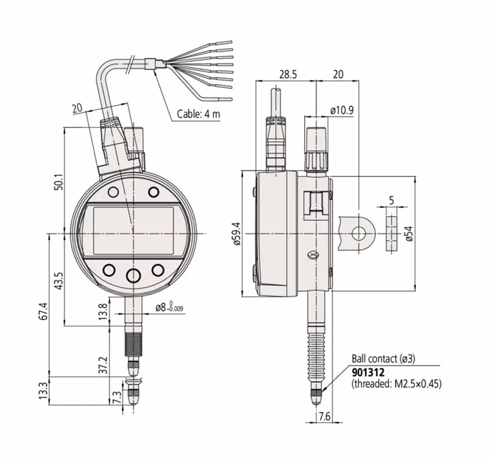 Dit is een Digimatic meetklok met externe voeding en een N-ch open kanaal -NG, OK, + NG-uitvoer.