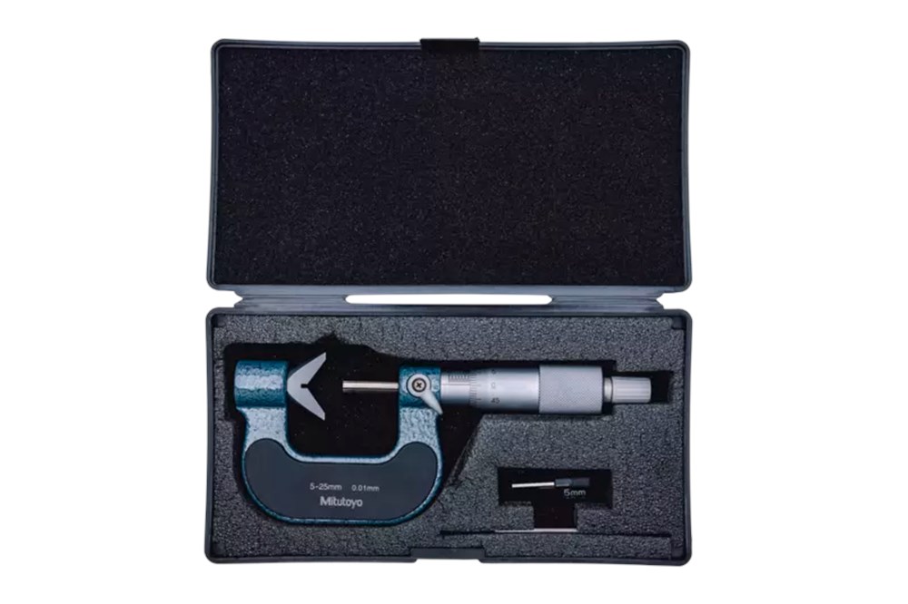 Deze schroefmaat met V-aambeeld helpt u met het meten van snijgereedschap en draadtap.