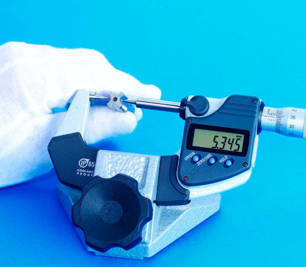 - Puntvormig aambeeld en spindel meetstiften in 2 hoekvarianten uitlopend in een kleine radius als meetpunt.