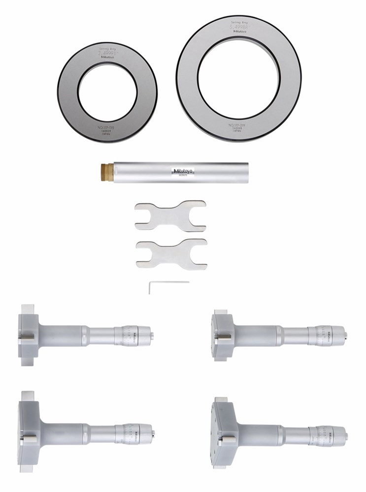 Een analoge Mitutoyo binnenschroefmaten set bestaande uit individuele binnenschroefmaten voor het meetbereik, de juiste instelringen en een verlengbuis voor diepte toepassingen. Contactvlakken van gehard staal. Een ratelstop garandeert herhaalbare metingen.