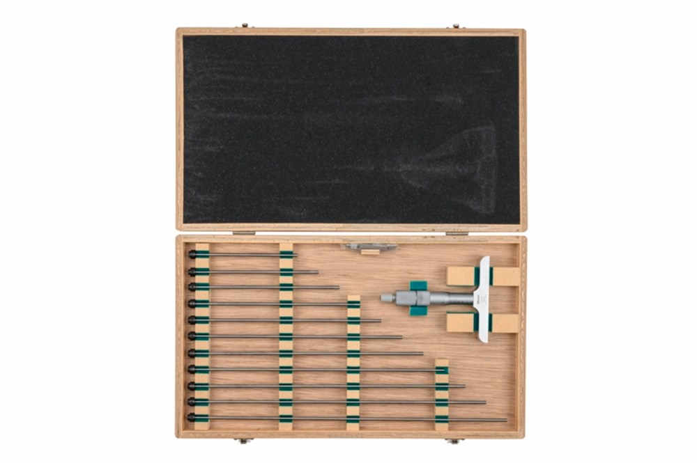 Een analoge Mitutoyo diepteschroefmaat met verwisselbare meetpennen voor een groot meetbereik. de 100mm basis is gemaakt van gereedschapsstaal, gehard en fijn gelept.