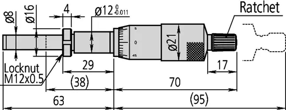 Een middelgrote, standaard, hoge resolutie, Mitutoyo inbouwschroefmaat met M12 klemmoer en robuuste 8 mm spindel met vlakke hardmetalen punt, met ratelstop.