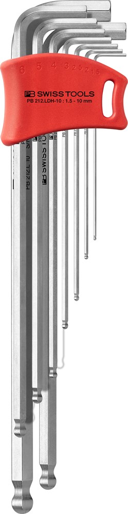 Inbussleutel met kogelkop voor binnen-zeskantschroeven, inch-maten, lange uitvoering. De kogelkop maakt het draaien van de schroeven tot onder een hoek van 30° mogelijk. Speciale legering met buitengewone elasticiteit bij hoge hardheid.