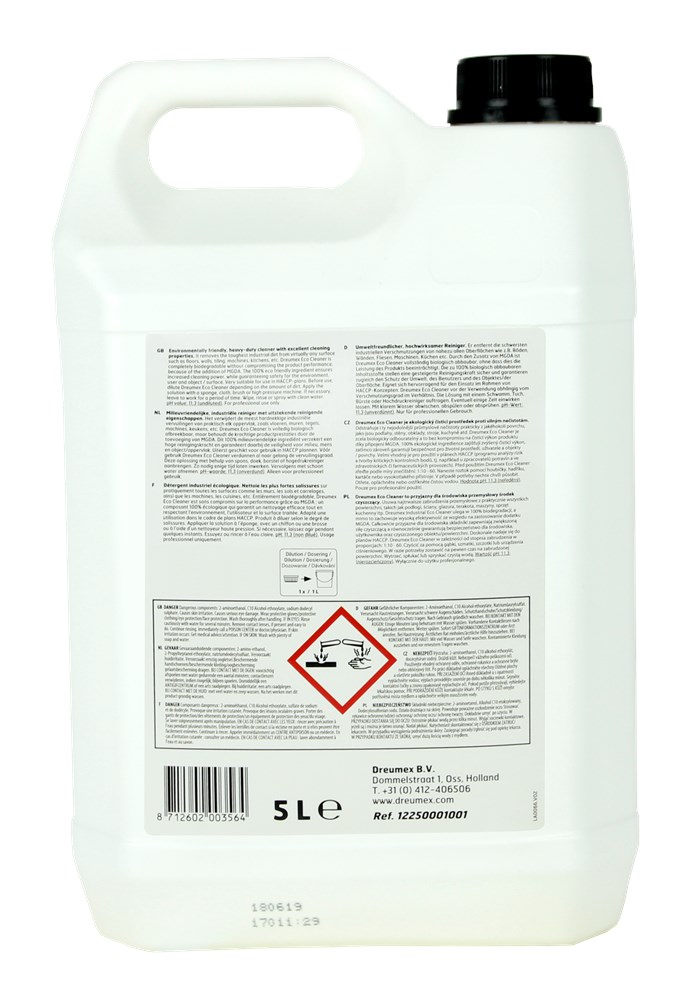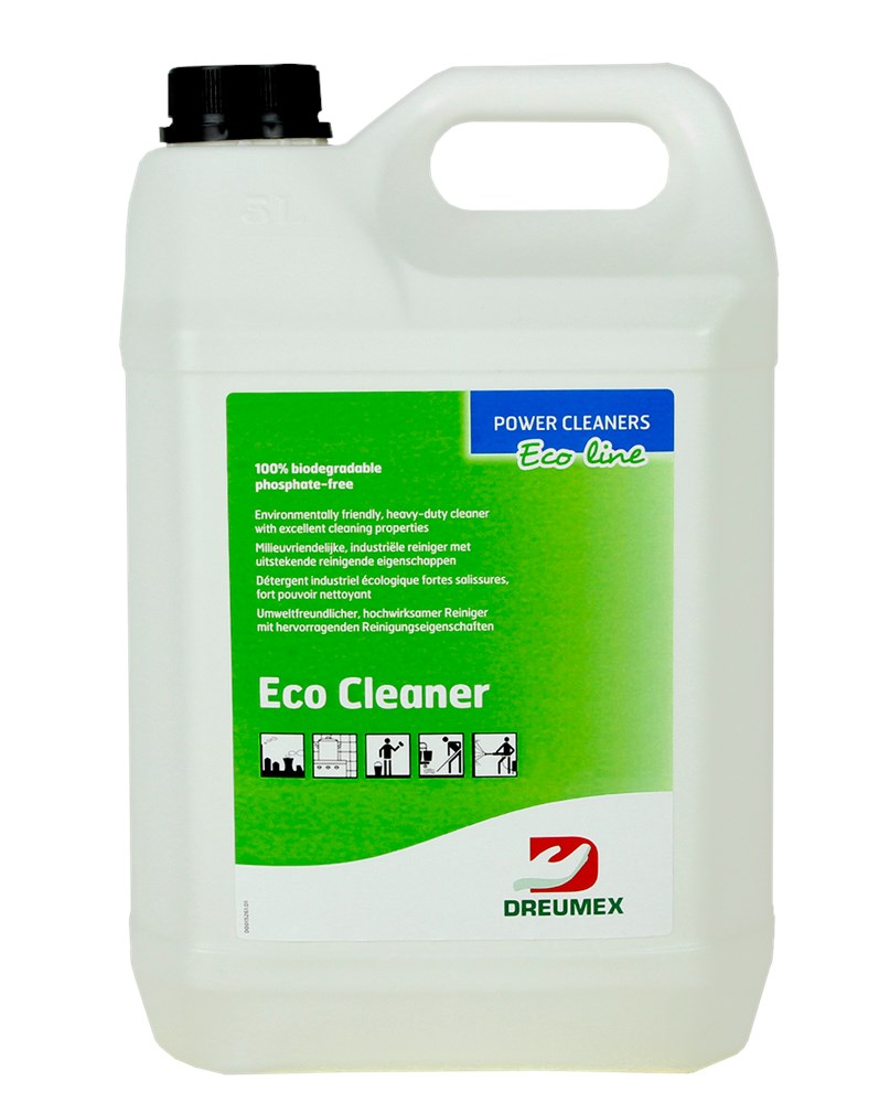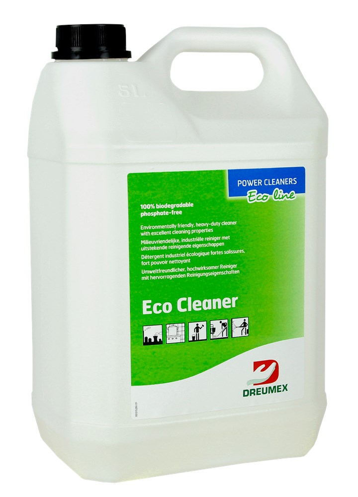 Dreumex Eco Cleaner is een milieuvriendelijke, industriële reiniger. Het verwijdert de meest hardnekkige industriële vervuilingen van praktisch elk oppervlak, zoals vloeren, muren, tegels, machines, keukens, etc. Dreumex Eco Cleaner is volledig biologisch afbreekbaar en garandeert daarbij de veiligheid voor milieu, mens en object/oppervlak, zonder afbreuk te doen aan de productprestaties. Uiterst geschikt voor gebruik in HACCP plannen.